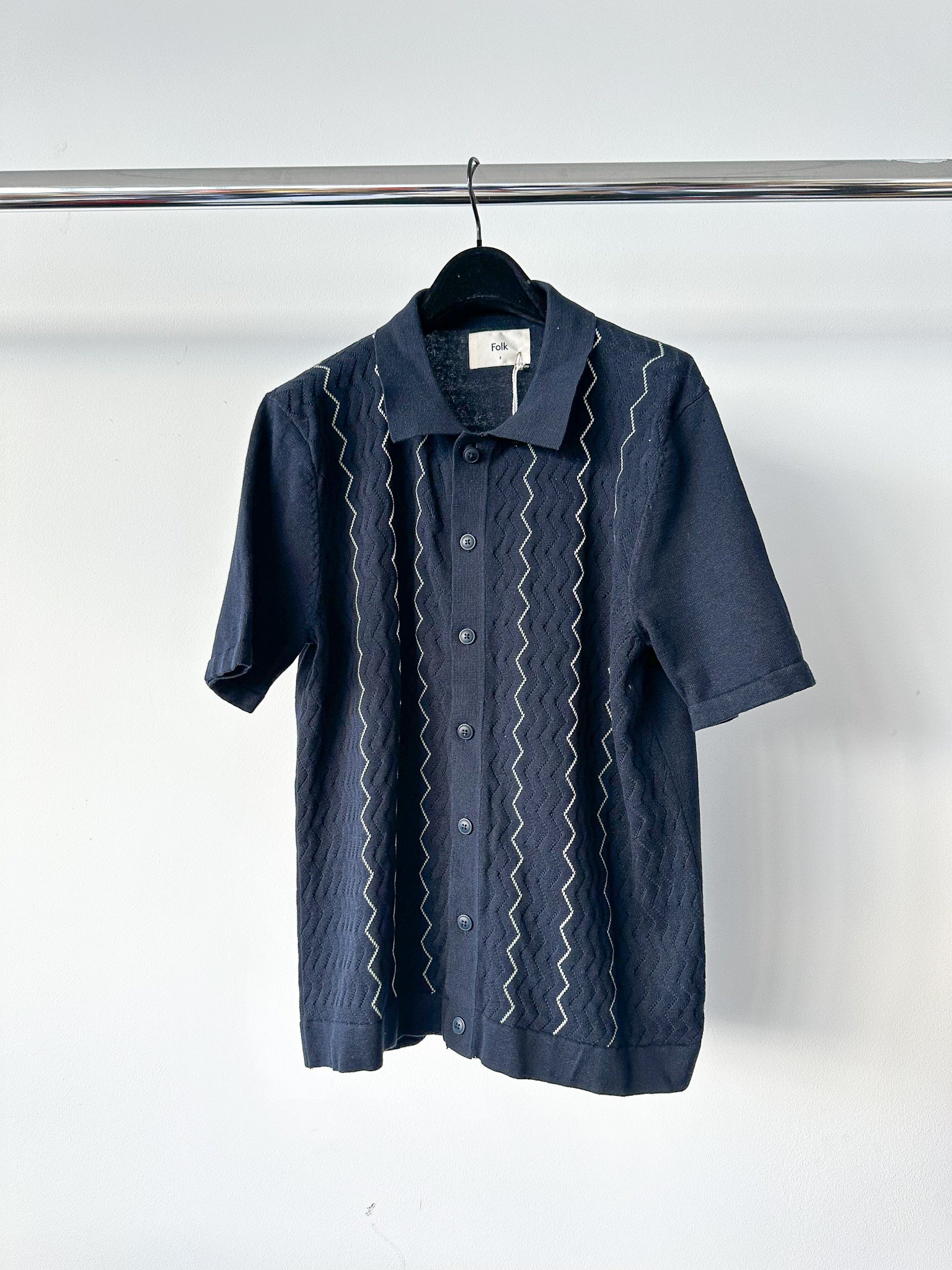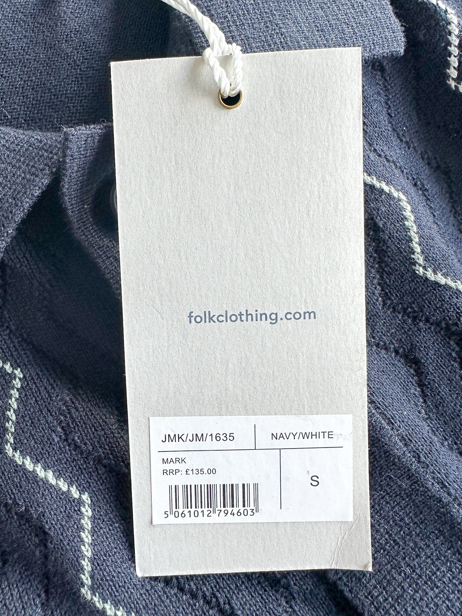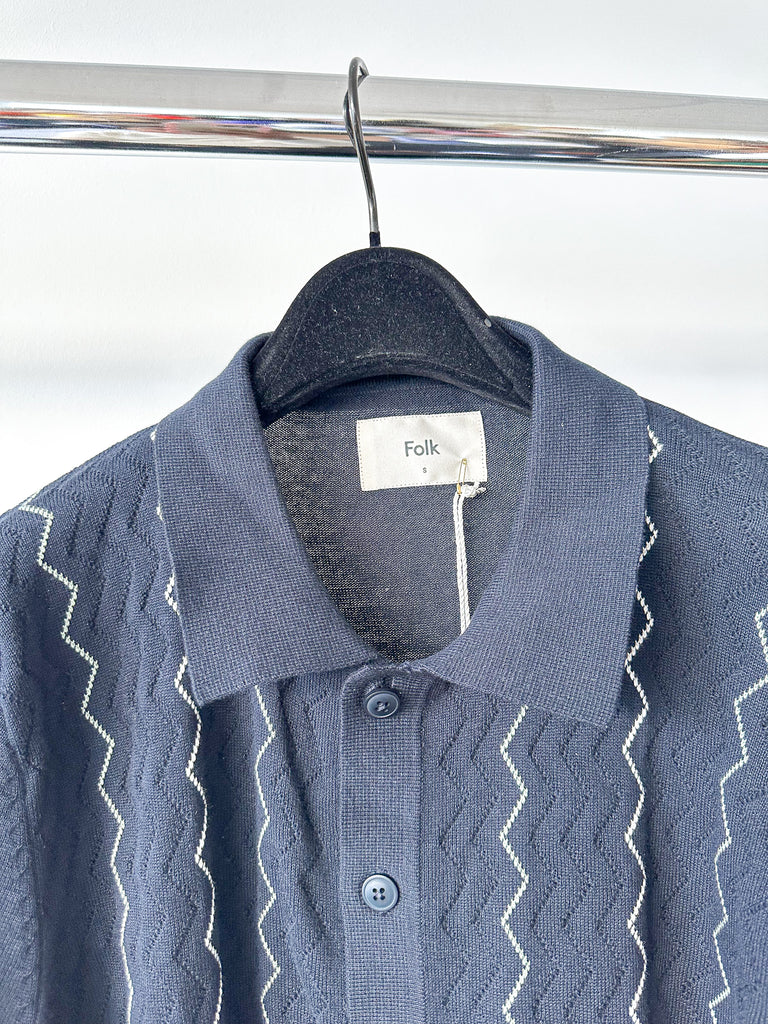Indulge in effortless style with the Folk Mark Knitted Button Up Polo Shirt. Crafted in a classic navy blue, this shirt features a unique knitted fabric and a button-up design, combining comfort and sophistication. Elevate your wardrobe with this versatile and timeless piece.