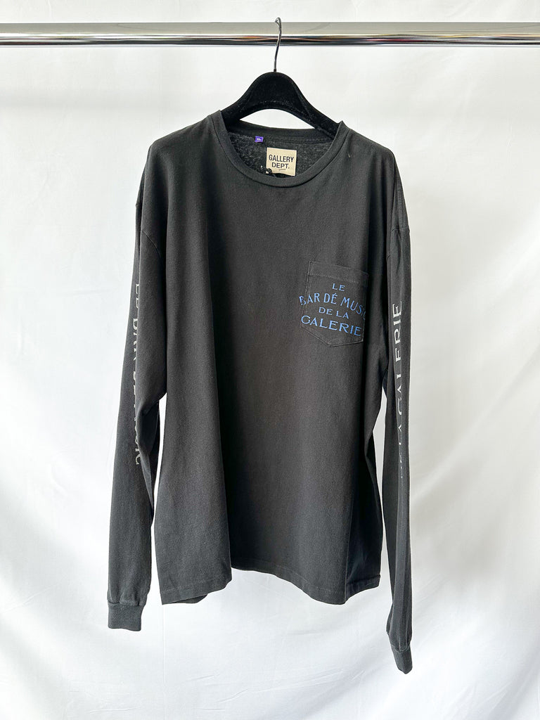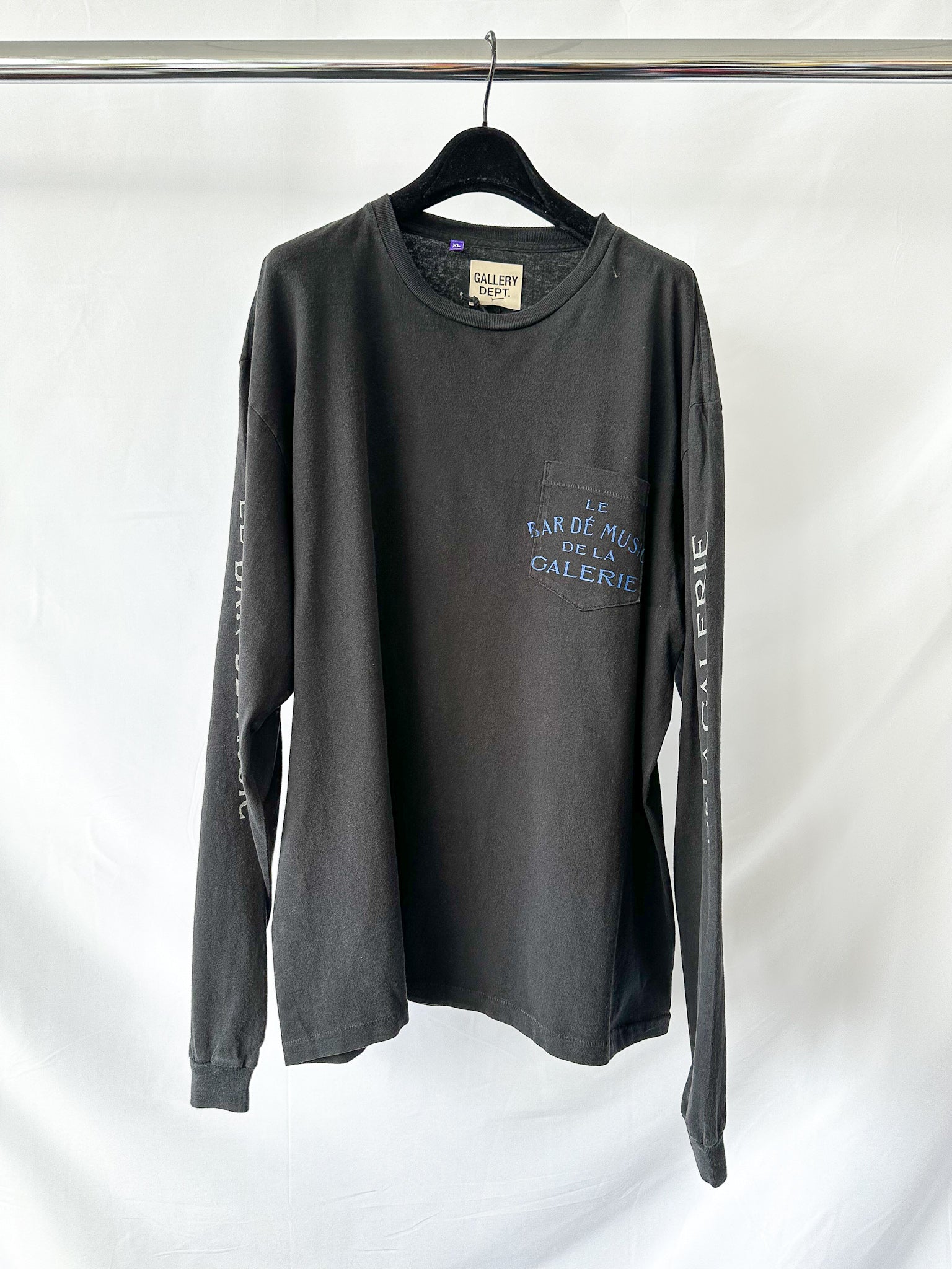 Make a bold statement with the Gallery Dept Le Bar Long Sleeve T Shirt in Black. Featuring striking screen-printed branding that reads "Le Bar de music de la Galerie," this shirt blends edgy streetwear with artistic flair. Its sleek black design ensures you stand out while staying effortlessly cool. Perfect for those who dare to express their unique style.