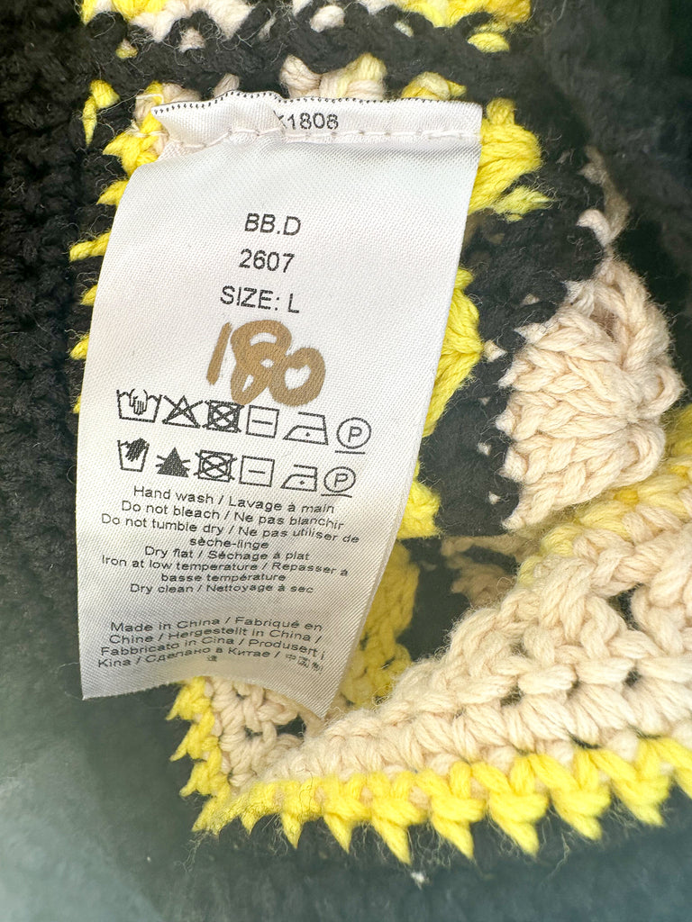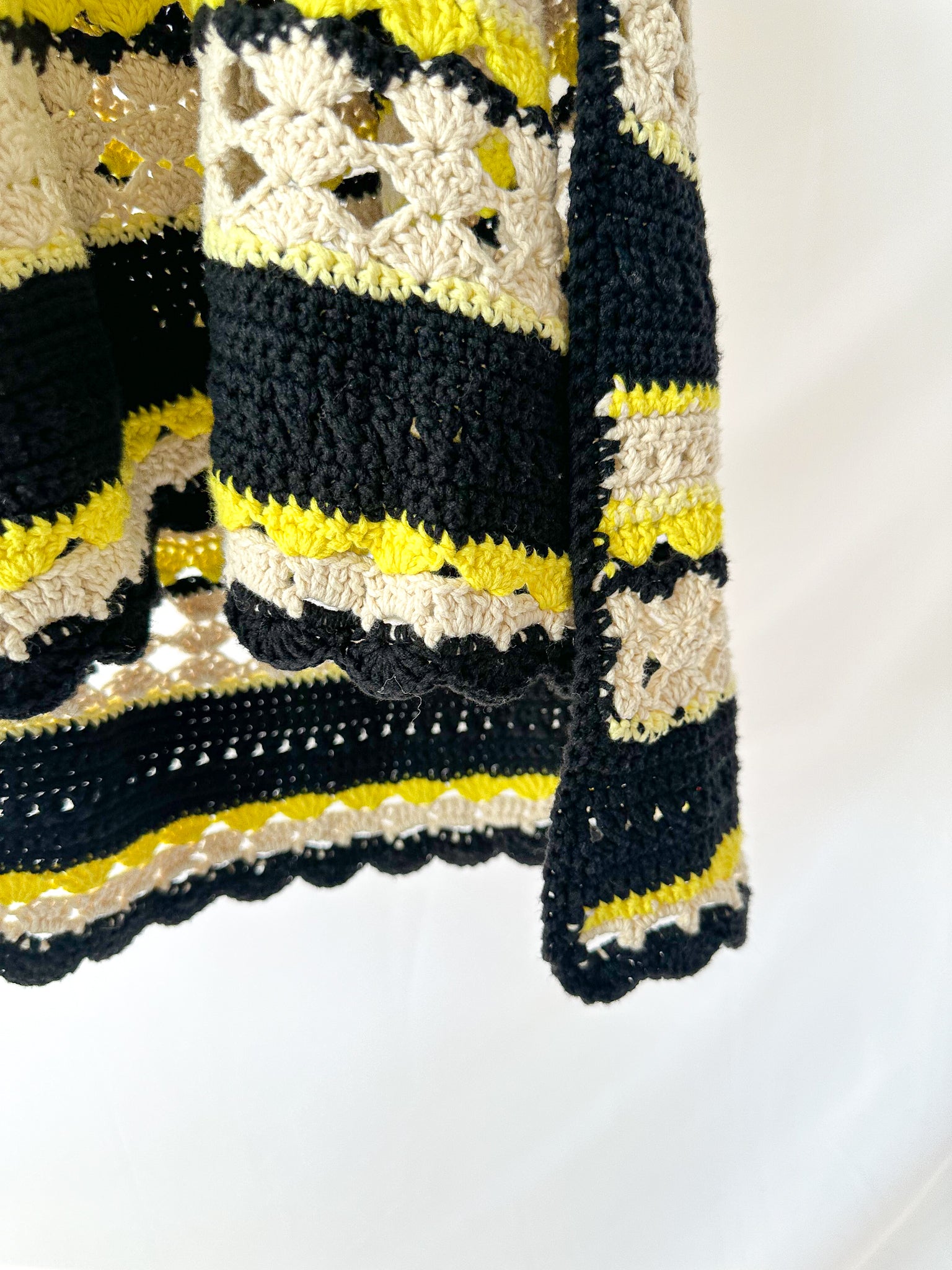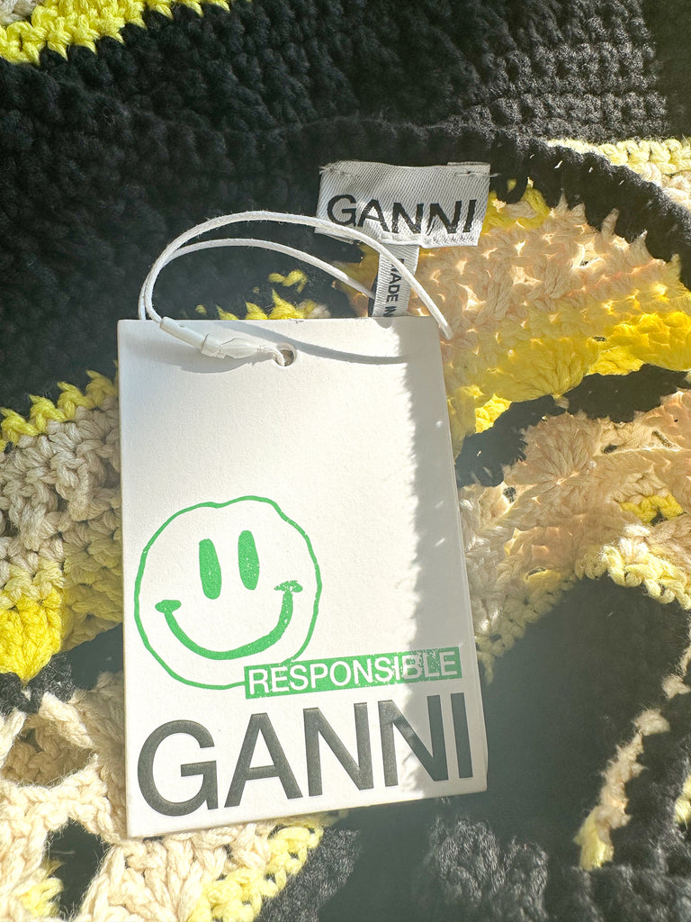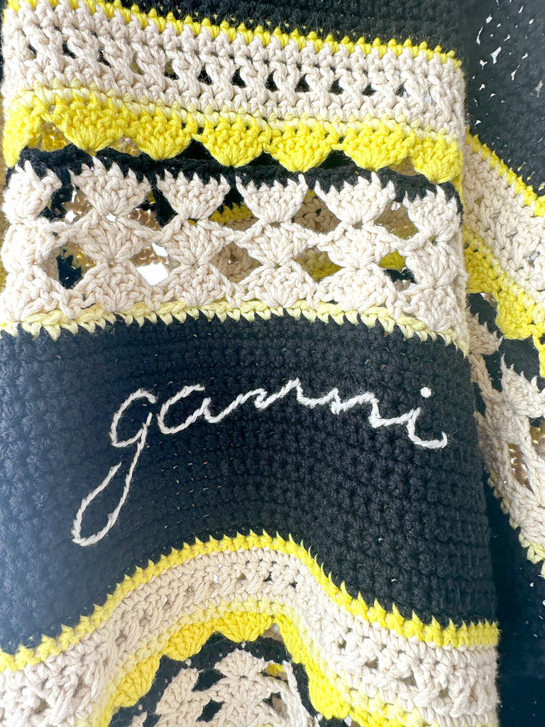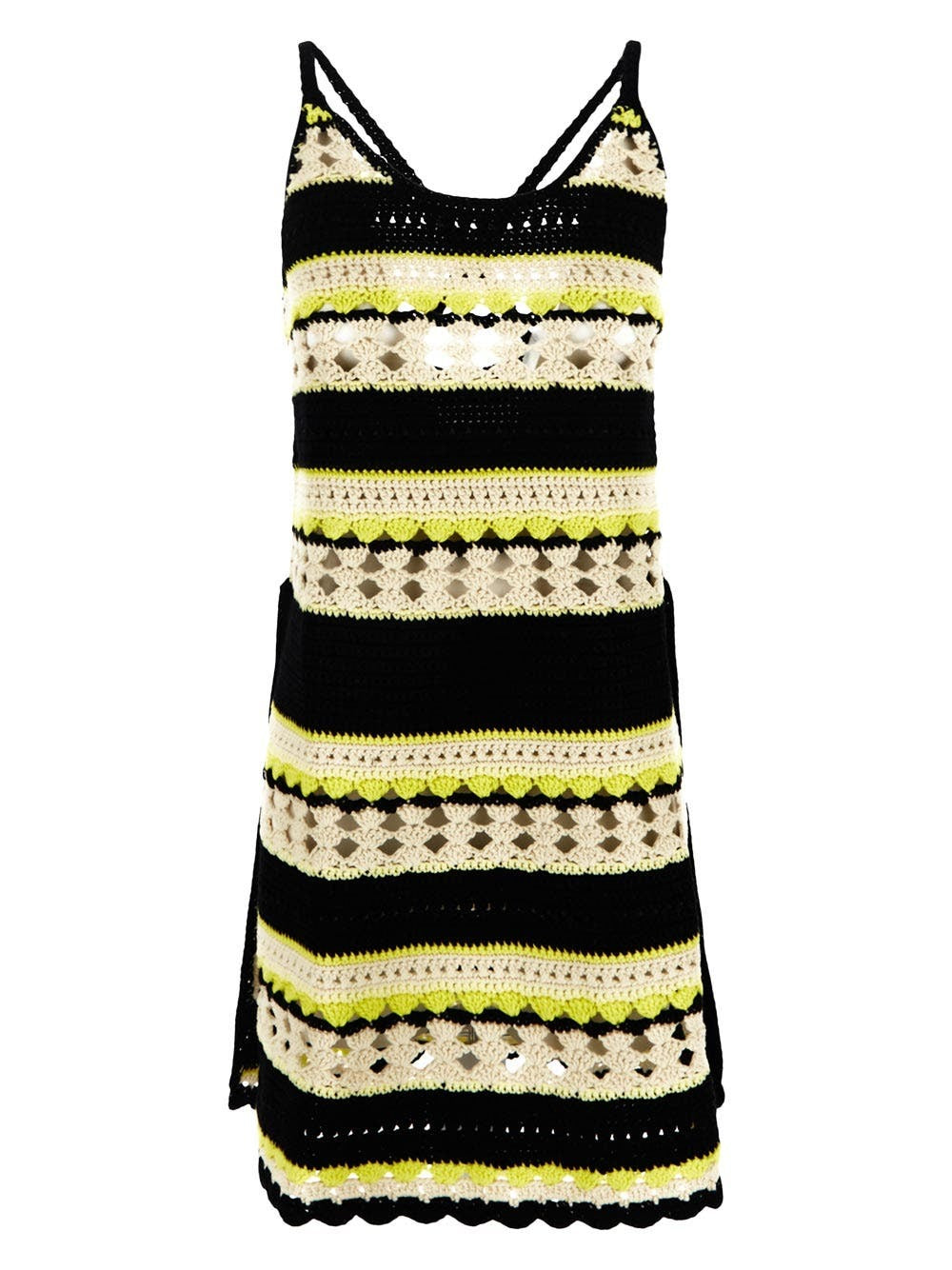 Turn heads in the Ganni Logo Crochet Striped Strappy Mini Dress, featuring a fun mix of black, yellow, and off-white stripes. Crafted from soft cotton, its crochet design showcases playful wavy edges and an open back with thin straps that cross for a flirty twist. The embroidered logo on the back adds a subtle signature touch, while the round neckline and open sides keep it breezy and effortless. Perfect for dancing through sunny days or sparkling nights!