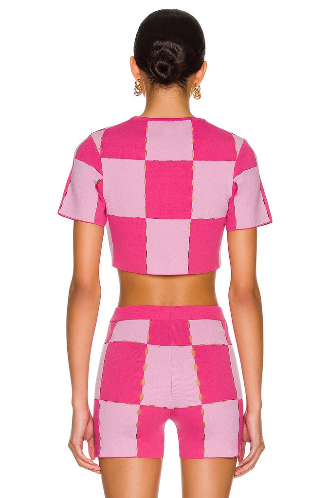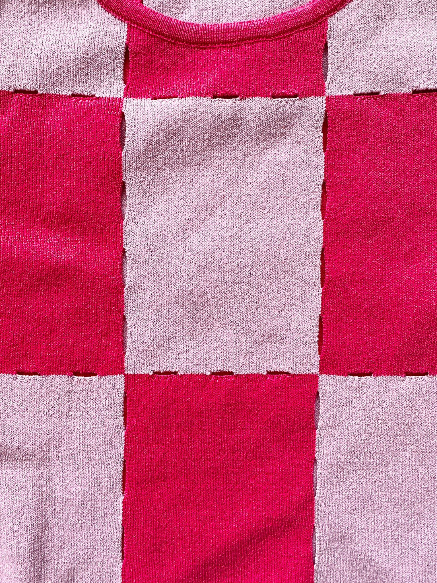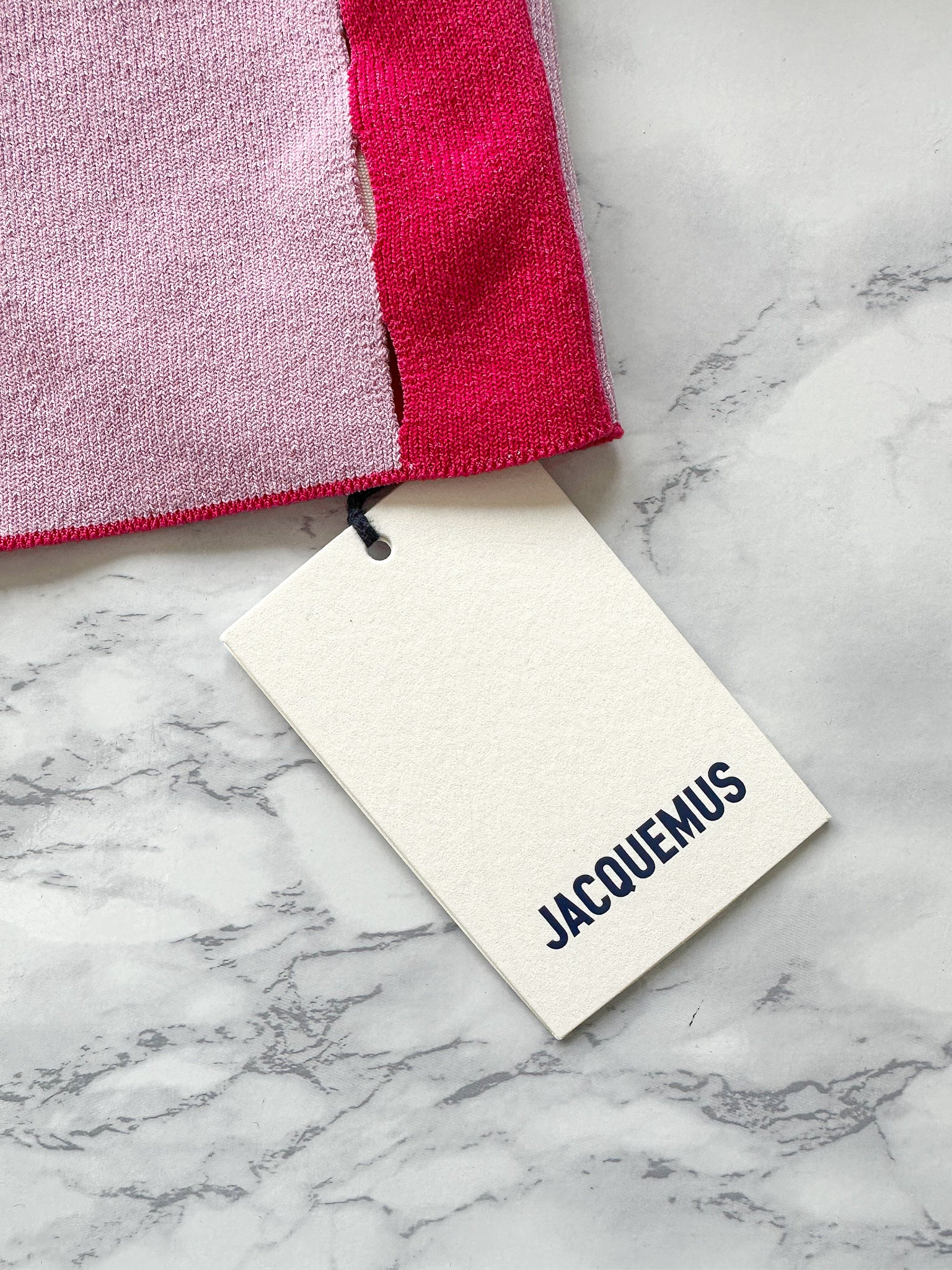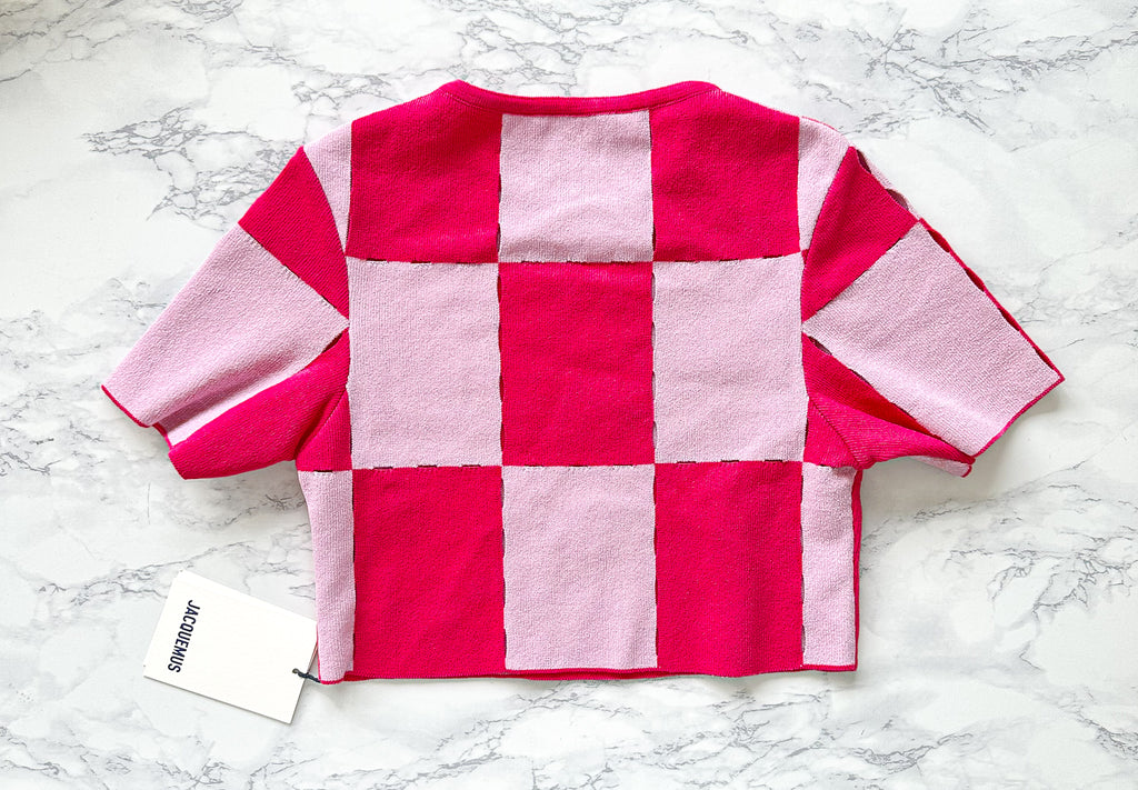 Rock the playful and quirky style of JENNIE from Blackpink with the Jacquemus Le Maille Gelato Pink Knit Top. Made from a stretchy cotton-blend knit, this crop top features micro cutouts and a unique checked pattern. Show some midriff and make a statement with this must-have piece!