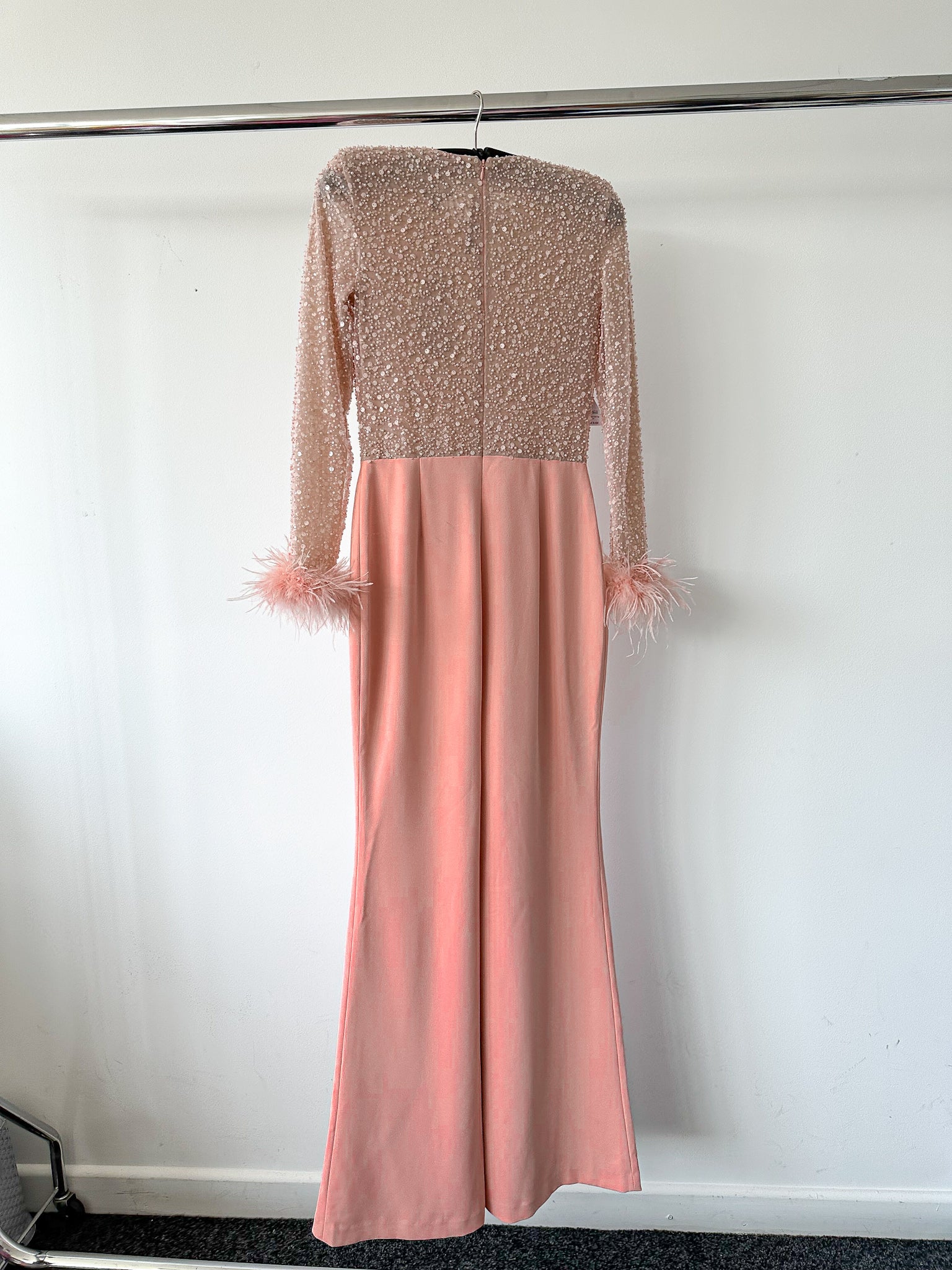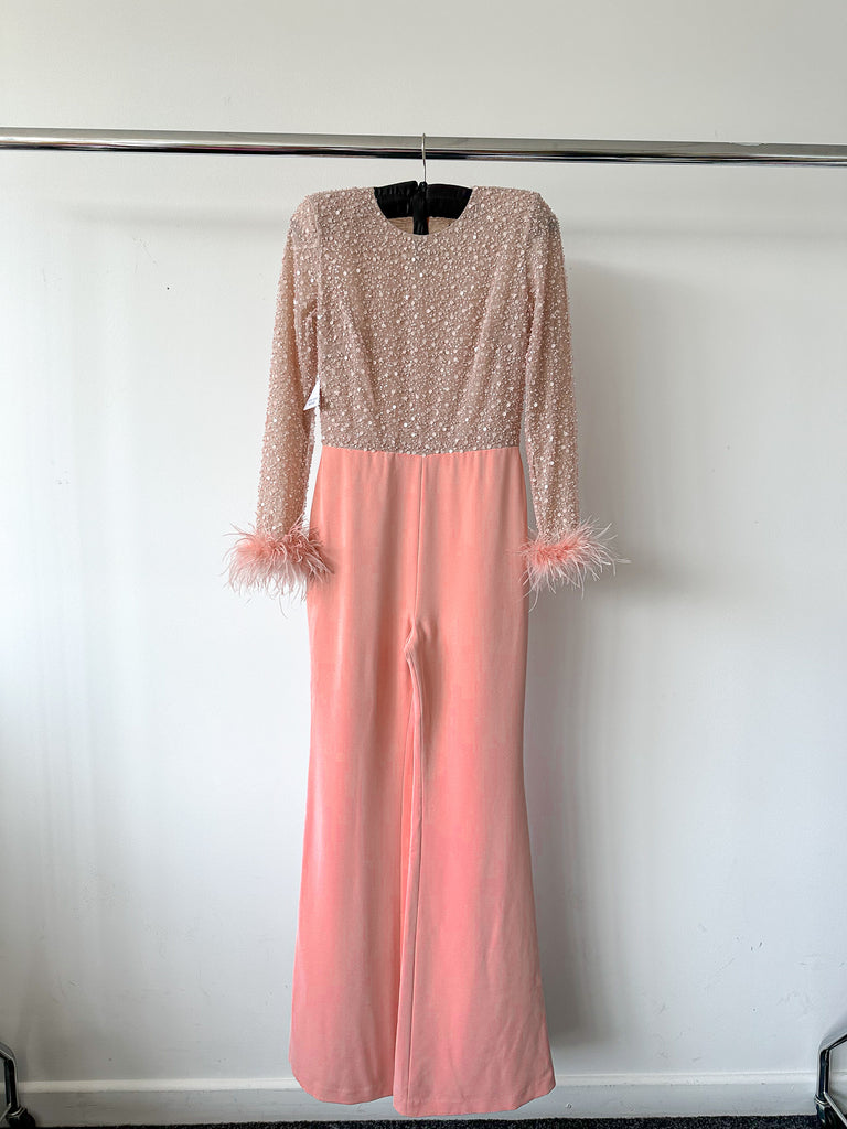 Nadine Merabi Pink Amelia Pearl Sequinned Feather Trim Cuff Jumpsuit