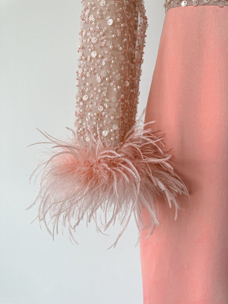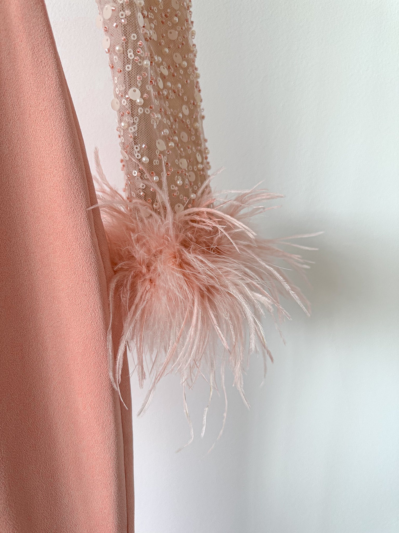 Celebrate in style with AMELIA, the ultimate jumpsuit for the risk-takers. Feather trim cuffs, intricate beading, and a detachable belt make this jumpsuit the perfect balance of bold and beautiful. So whether you're dancing all night or enjoying a day out, this fully lined crepe jumpsuit will have you looking and feeling confident. Don't forget to check out the featherless Misha Pink Jumpsuit for a more subtle option.