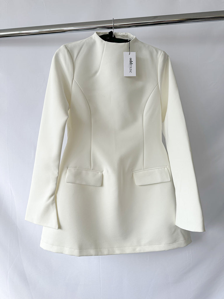 This Odd Muse mini dress stands out with its sharp, architectural design and tailored fit. Sporting a high neckline and long sleeves, it offers a chic and polished look. The fitted bodice gently flares into a playful skirt, while mock pocket flaps at the waist bring a stylish twist. Ideal for lovers of minimalist fashion with a dash of modern flair, this Women's Long Sleeve Mini Dress showcases meticulous craftsmanship through its sleek lines and perfect cut.