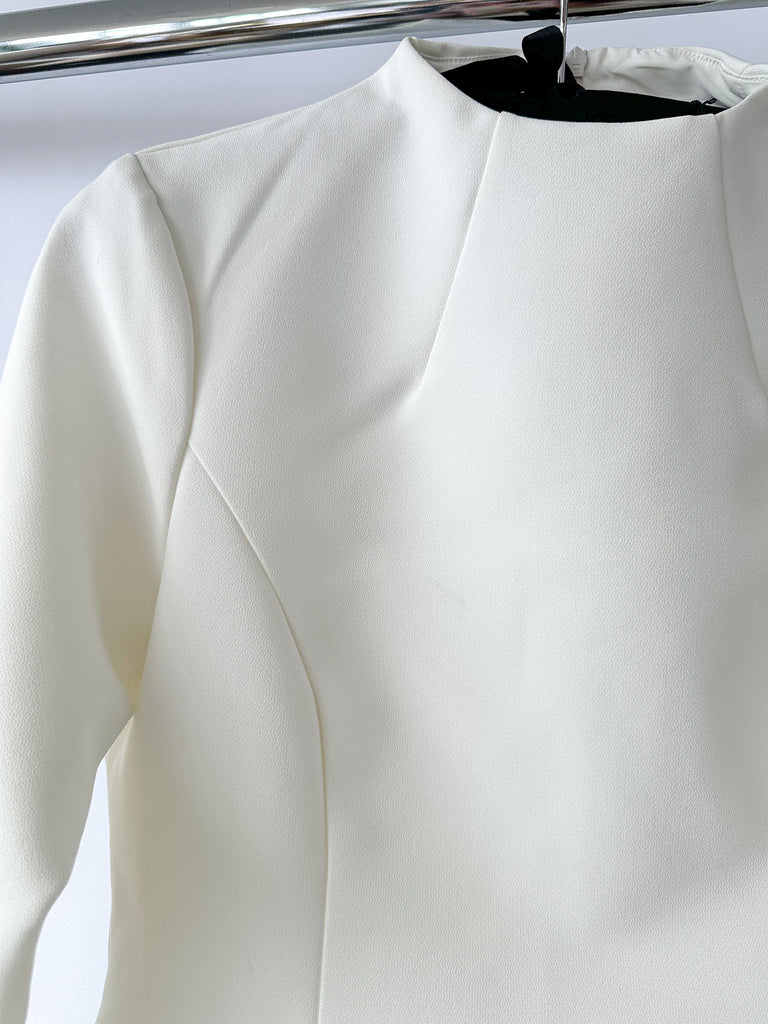 - The high neckline and long sleeves offer versatile styling options for day-to-night wear.