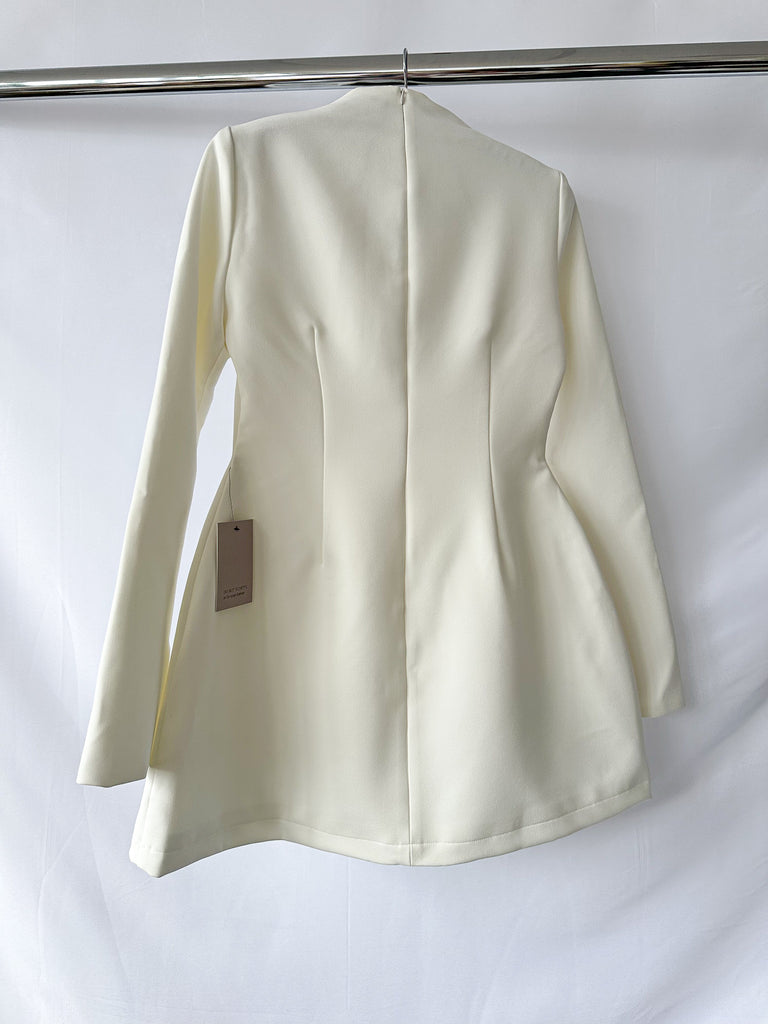 - Decorative flap pockets at the waist create visual interest and enhance the structured silhouette.