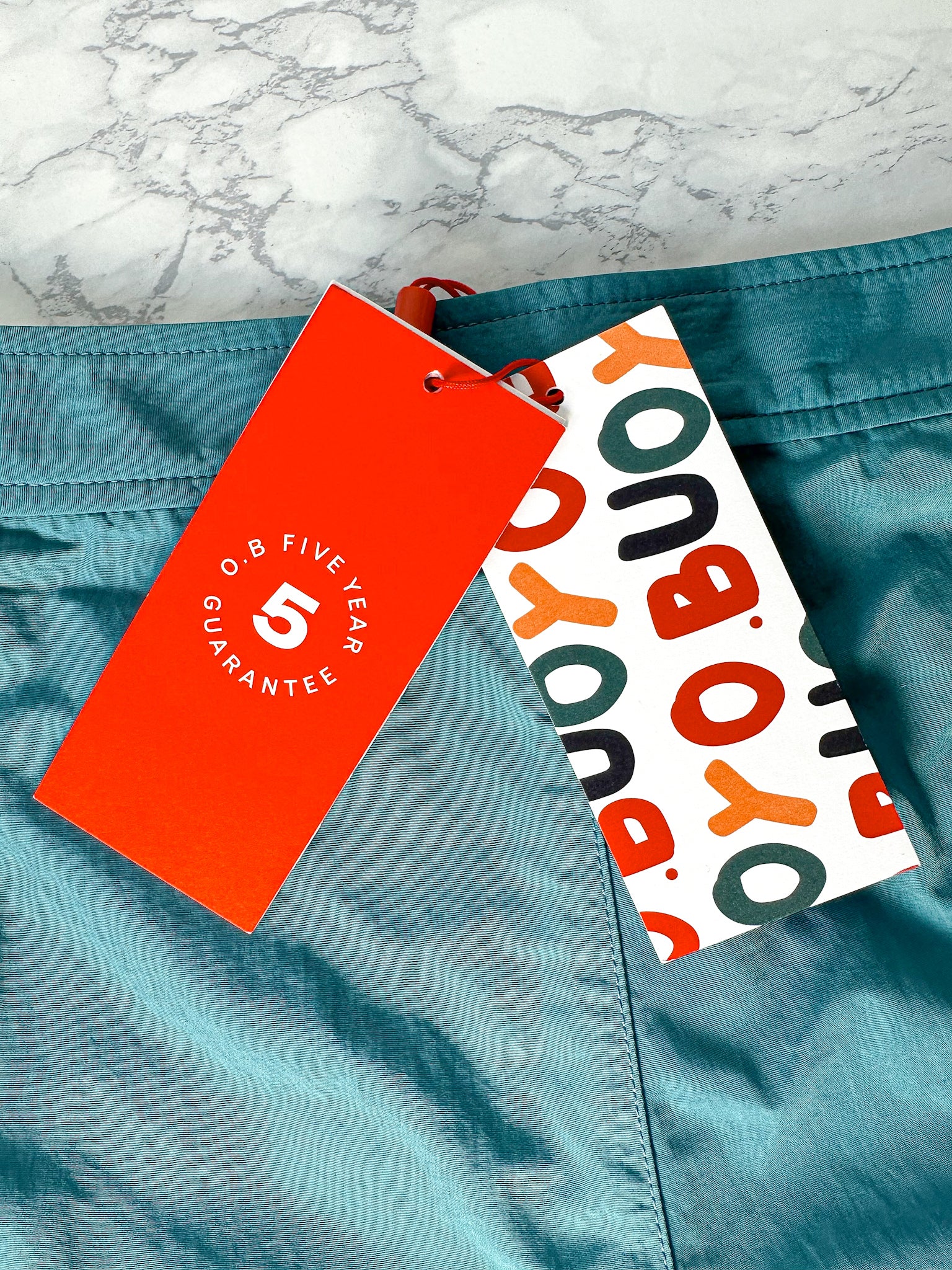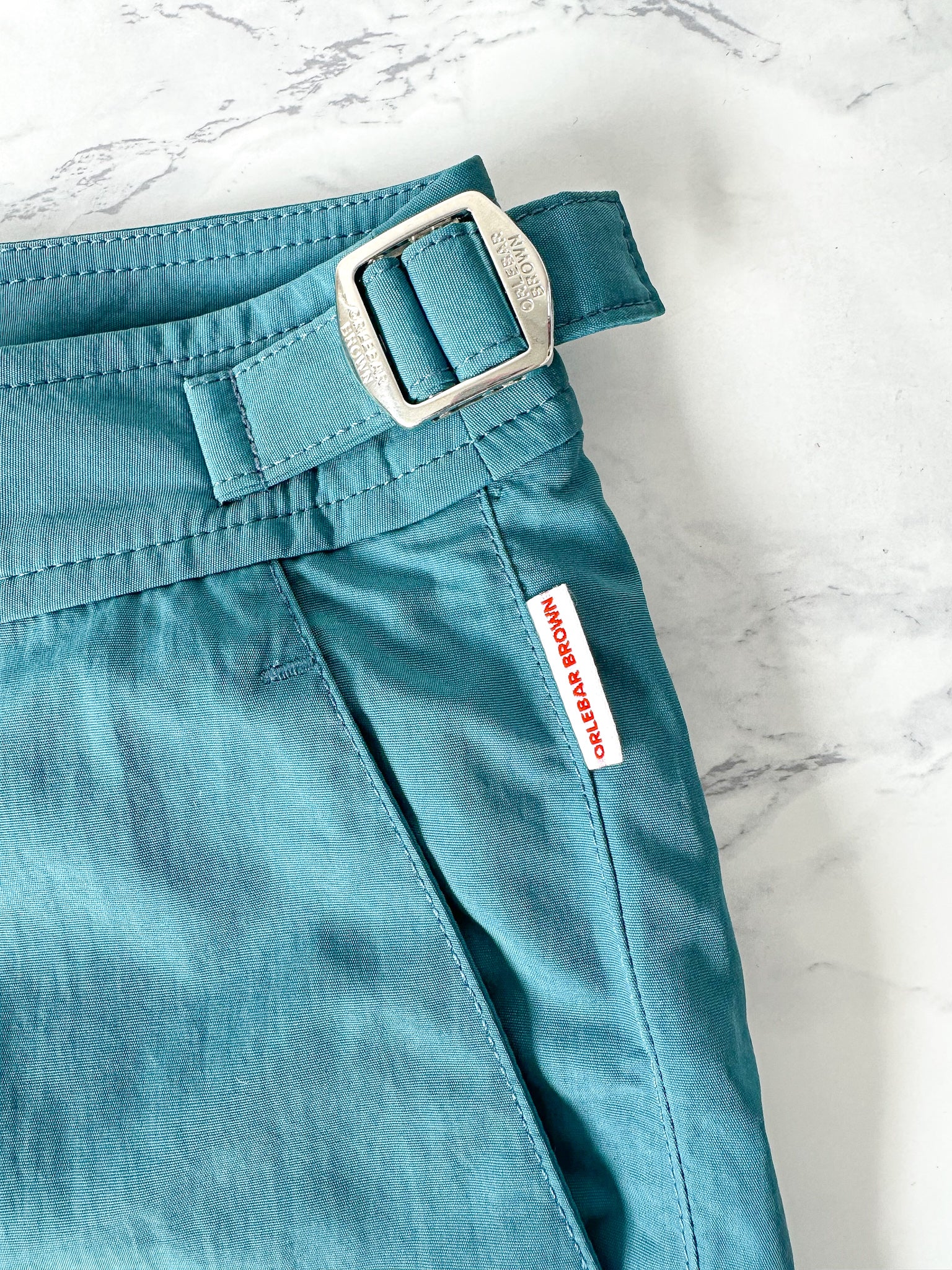 Achieve both elegance and style with Orlebar Brown's Bulldog swim shorts in a trendy light blue hue. These tailored shorts are crafted with fast-drying material and adjustable side fasteners, providing an impeccable fit. The unique OBUOY print on the lower right leg adds a touch of sophistication. Made of 100% polyester, these shorts perfectly balance fashion and function.