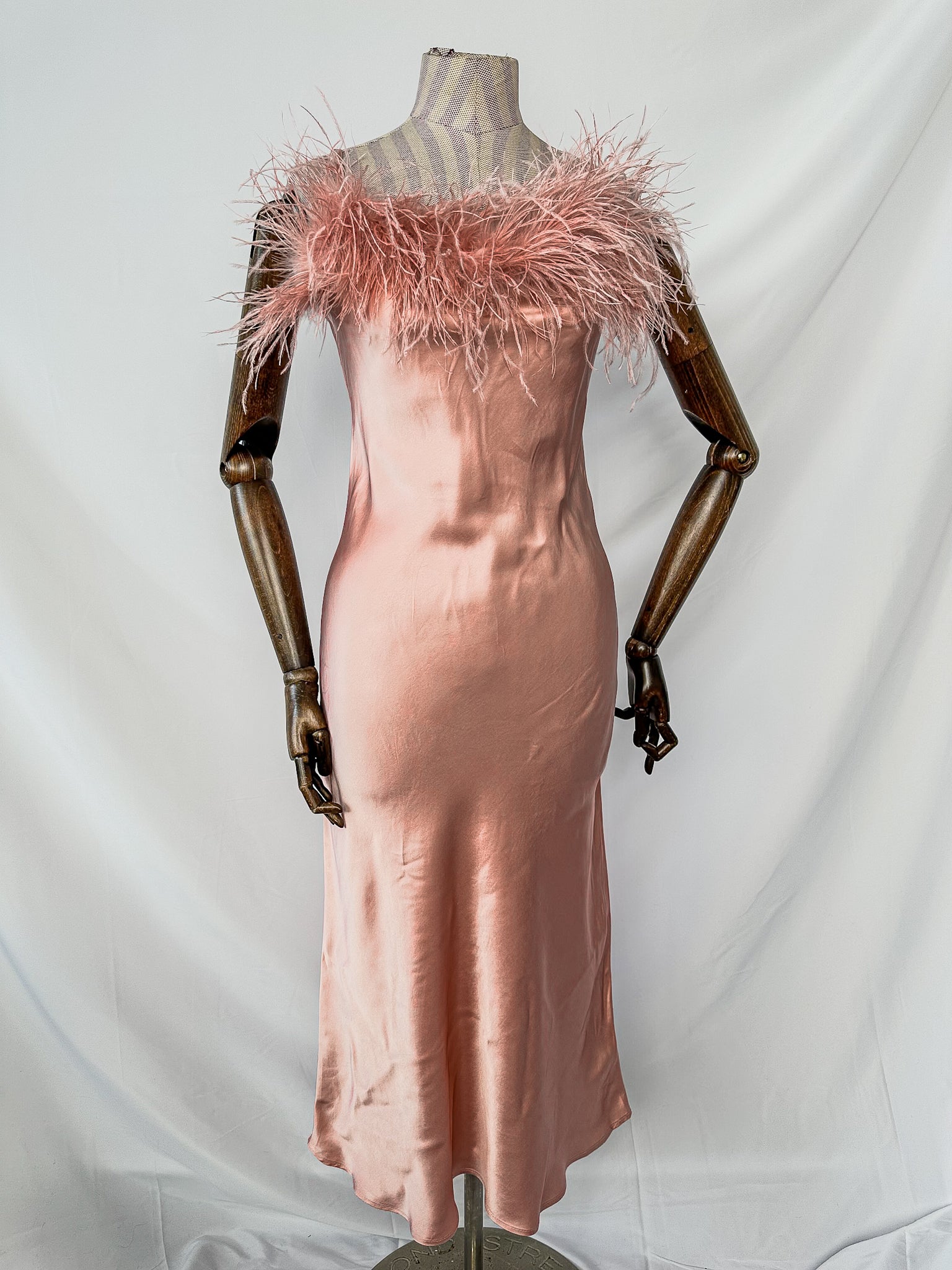Sleeper Boheme Pink Satin Ostrich Feather Trim Midi Slip Dress