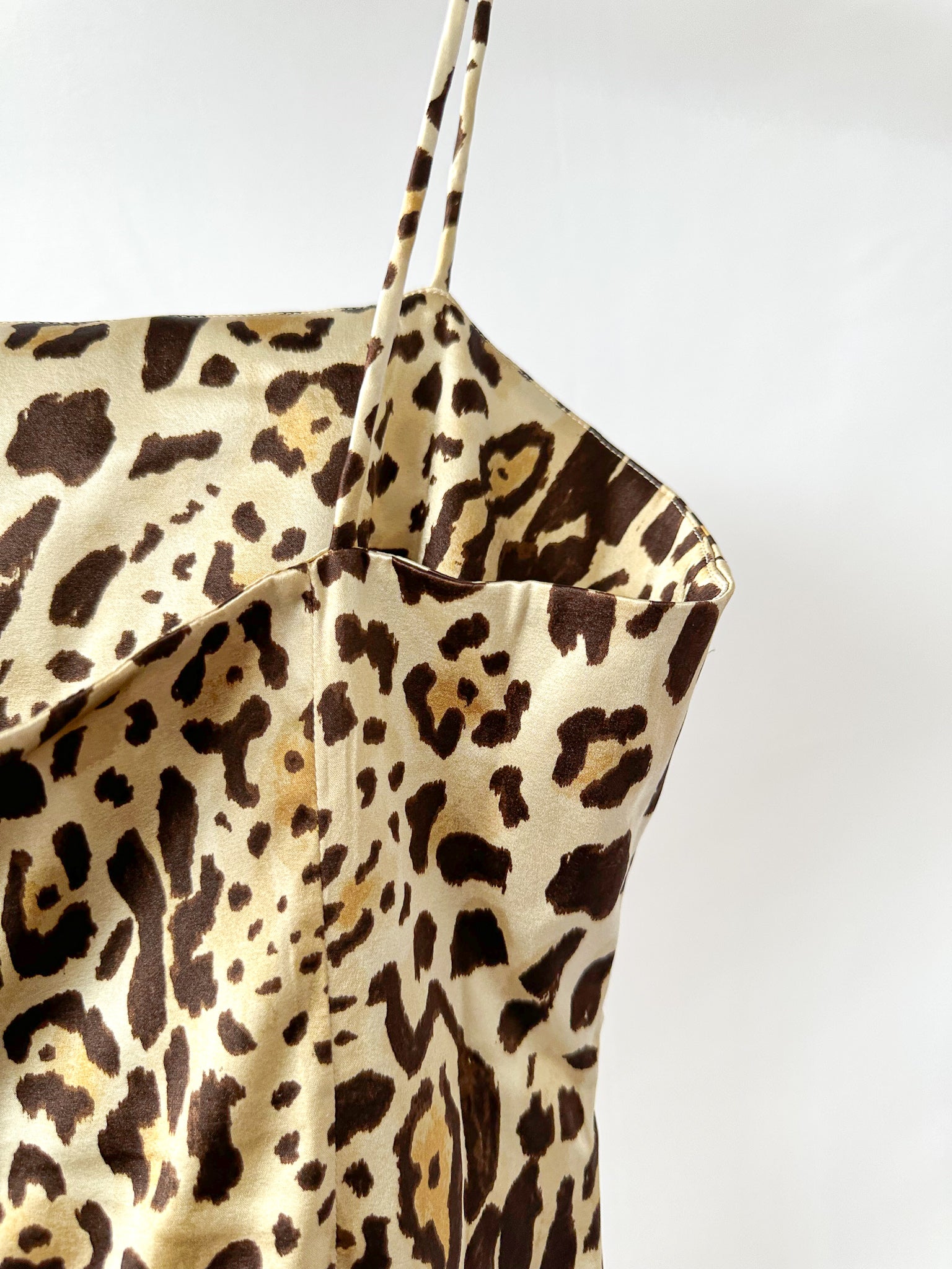 - Flowy semi-sheen charmeuse fabric with leopard design
