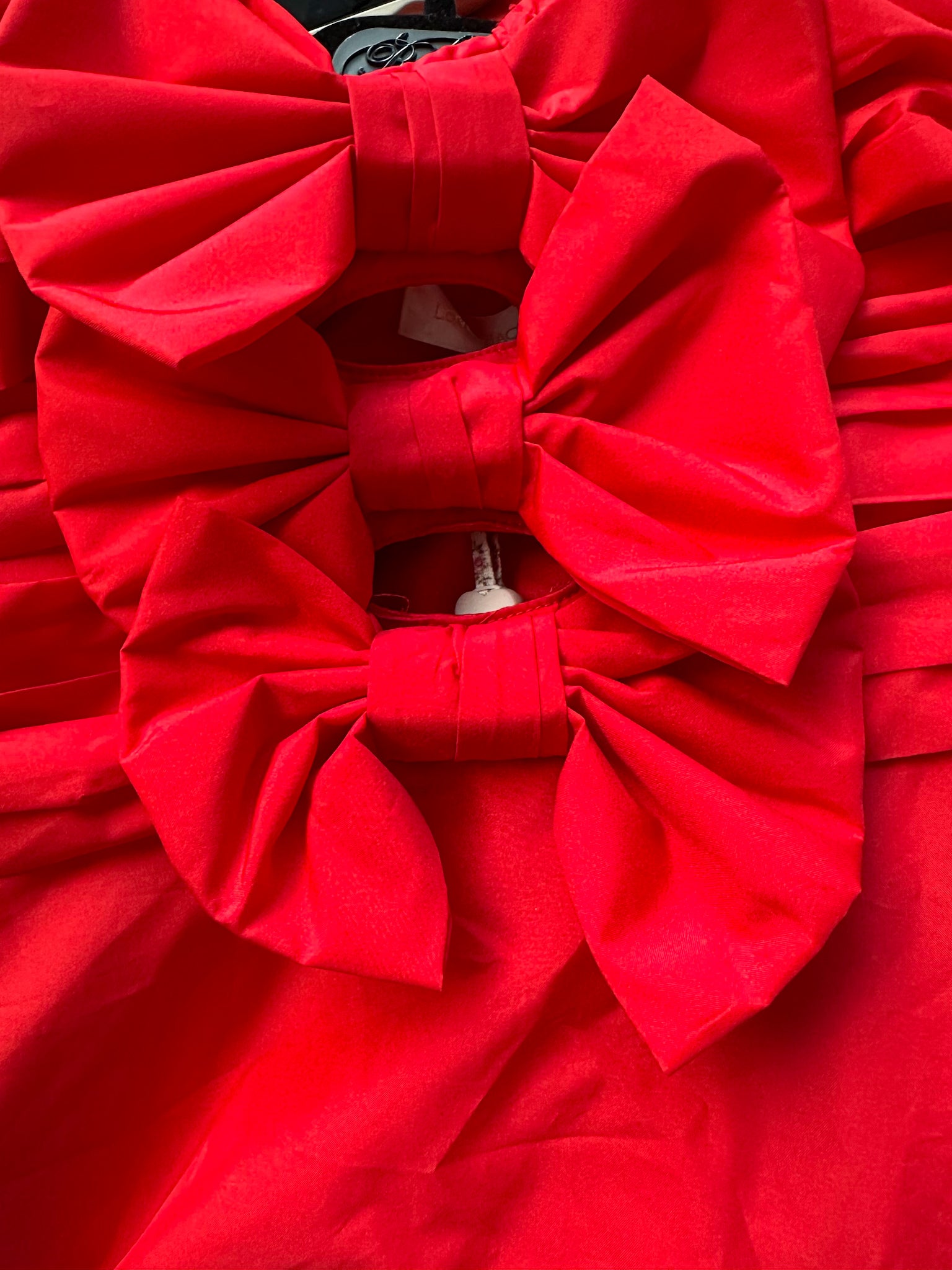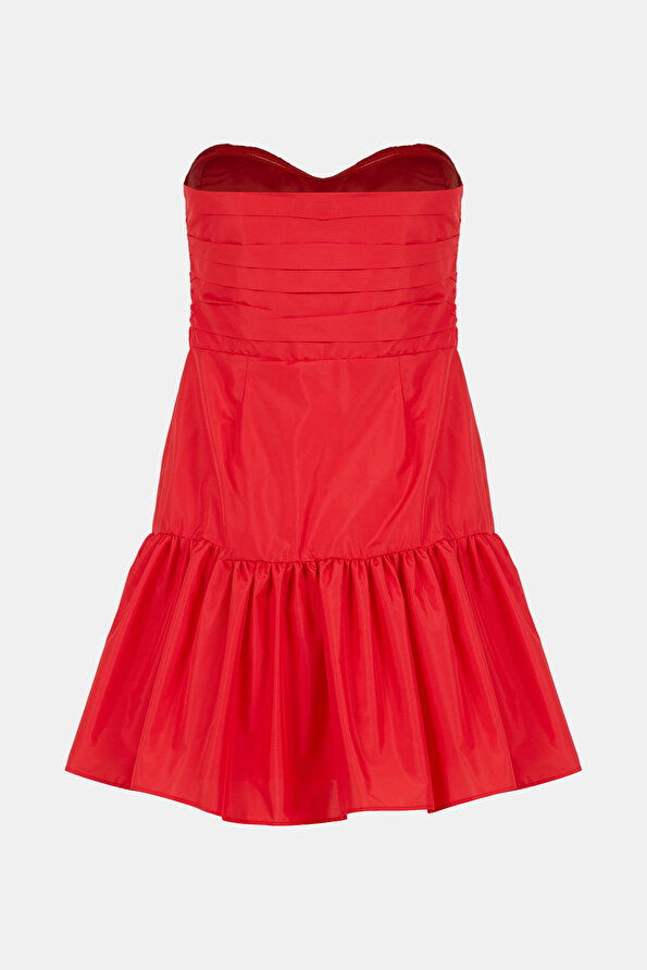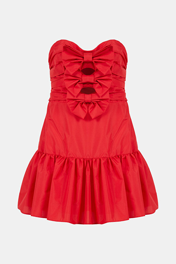 The Woodlow Dress by Love Shack Fancy captures effortless elegance with its luxurious taffeta construction and refined strapless silhouette. Featuring a structured bustier bodice adorned with three delicate tied bows at the center front, this mini dress balances sophistication with playful charm through strategically placed cutouts. Integrated gripper tape at the chest ensures a secure, comfortable fit throughout the day. Perfect for festive occasions and evening celebrations, this piece delivers both style and wearability.