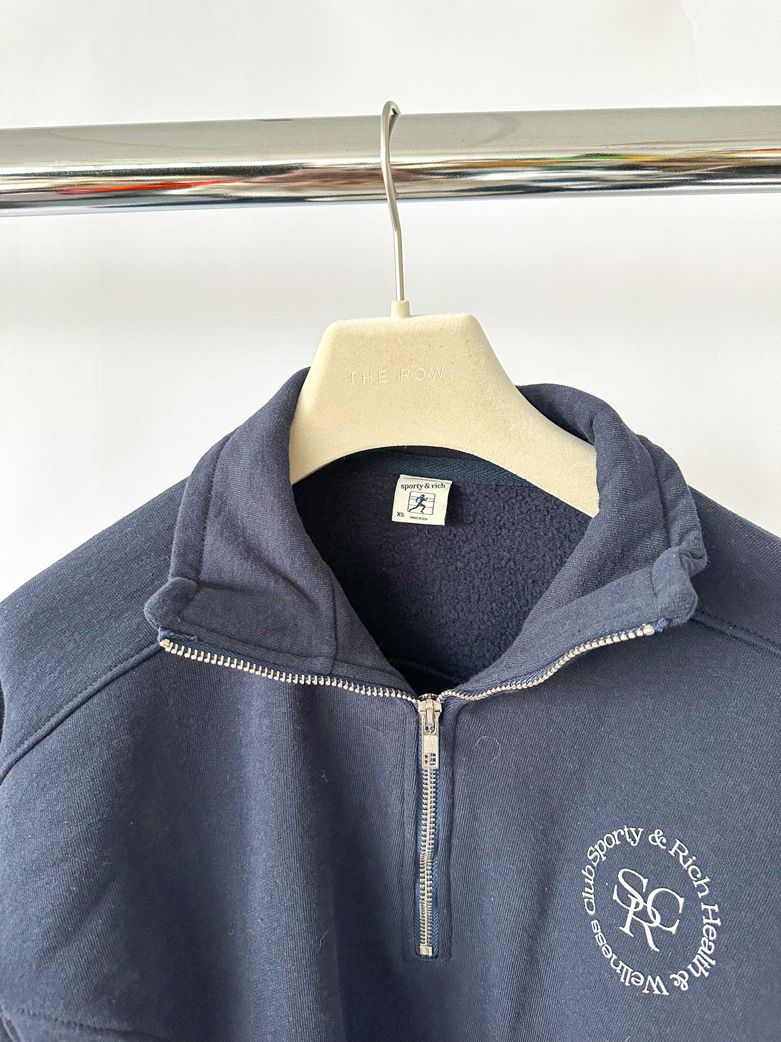 Elevate your casual wardrobe with this navy quarter zip sweatshirt from Sporty & Rich. Featuring the iconic logo on the front, it's the perfect blend of athletic style and everyday comfort. The quarter zip design offers easy layering and ventilation, while the soft fabric keeps you cosy whether you're heading to the gym or grabbing coffee with friends. A versatile piece that works as hard as you do.